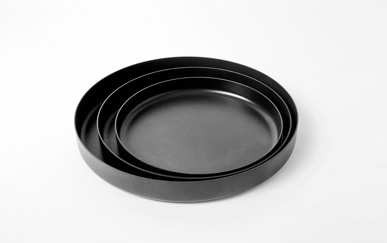 Las bandejas realizadas en aluminio de tres milímetros de grosor pueden introducirse en hornos gracias al acabado antiadherente de larga duración Whitford, libre de PFOA, y permite exponer los alimentos directamente desde su fuente de calor. Los trípodes disponen de terminales de silicona que evitan el rallado y a la vez soportan elevadas temperaturas.