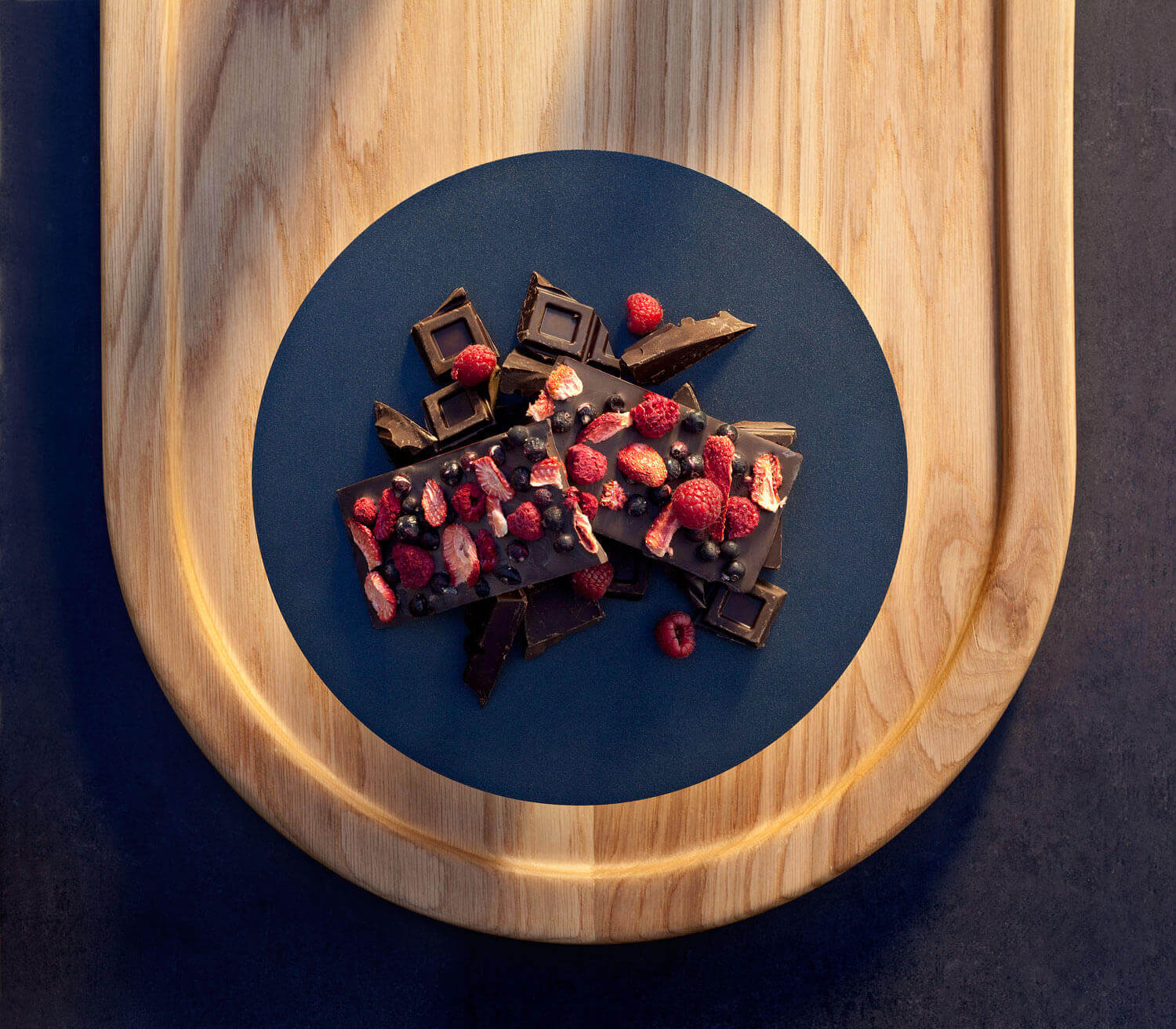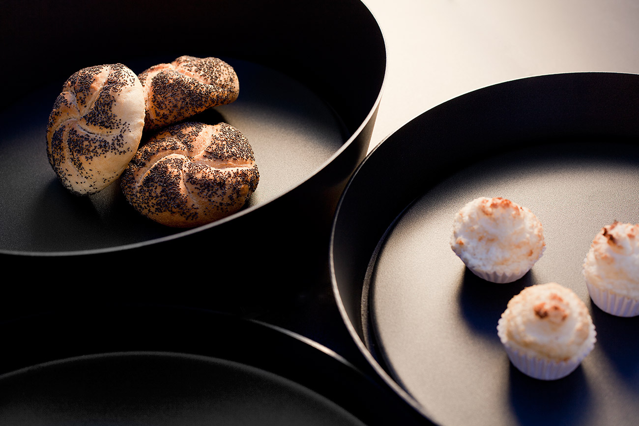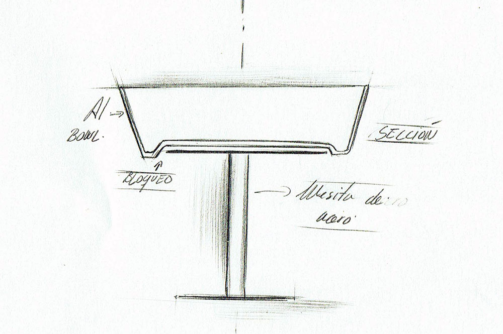Navona consta de una plataforma de roble macizo y dos mesitas de acero de distinta altura en las que se pueden encajar bowls de aluminio de dos diferentes capacidades. Ofrece un amplio abanico de posibilidades a nivel compositivo, gracias a su geometría, los elementos que la componen se pueden disponer de diferente manera según los requisitos.