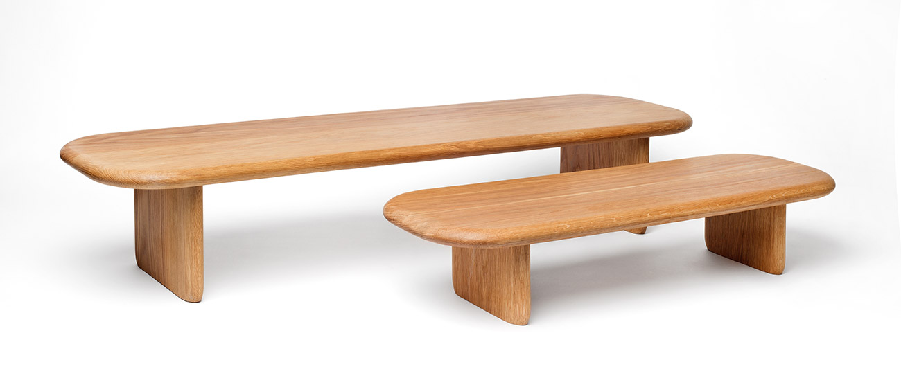 Bancos para la presentación de alimentos en un buffet, realizados en madera de roble mazizo y acabados en aceite apto para uso alimentario. Los sutiles cantos redondeados y una robusta sencillez definen el proyecto.