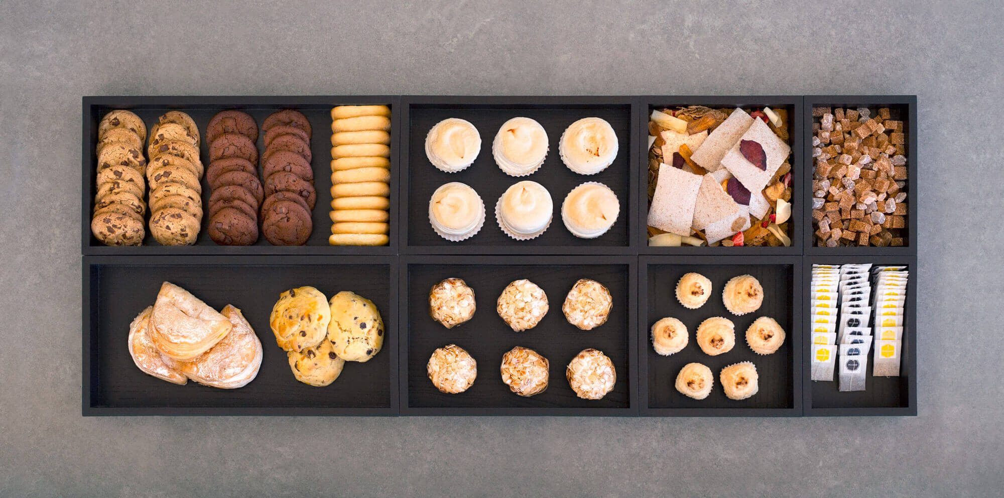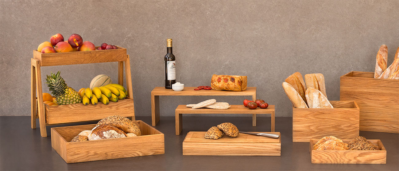 Un sistema de presentación modular compuesto por diferentes elementos. Piezas altas y bajas para elevar o reducir el tamaño y la percepción visual de cada composición. Cajas que se pueden disponer a nivel o inclinadas, baskets que a la vez funcionan como peanas, bancos a modo de puentes e incluso una estructura de dos pisos con sus correspondientes bandejas que se erige como el rascacielos de la colección.